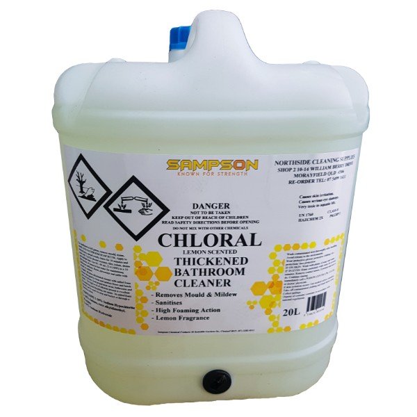 Sampson Chloral Chlorinated Alkaline Cleaner is a thickened, high-foaming cleaner specially designed to tackle tough bathroom cleaning tasks. With its powerful blend of sodium hypochlorite and sodium hydroxide, this cleaner removes mould, mildew, stains, soap scum, and unpleasant odors. The added lemon fragrance leaves your space smelling fresh, while its strong sanitising properties ensure a hygienic environment. Ideal for use in bathrooms, kitchens, and food preparation areas, Chloral effectively cleans and sanitises surfaces like tiles, toilets, drains, and shower recesses. Available in various sizes for both regular and industrial use.