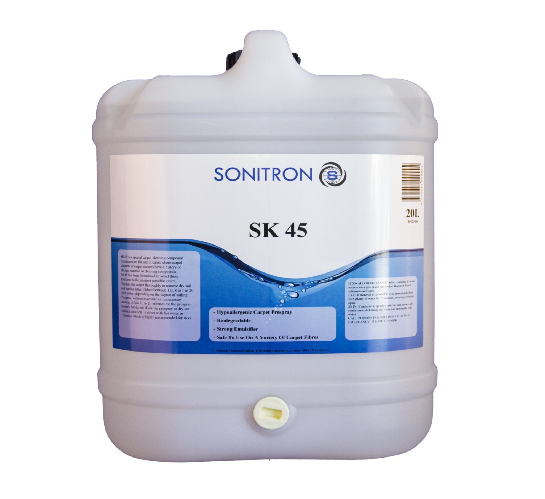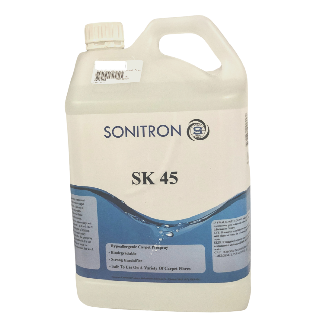 Revitalise carpets with SK45 Hypoallergenic Prespray, a gentle, hypoallergenic cleaning solution crafted for Australian restoration pros. Designed for households with asthma or allergy concerns, this prespray safely removes stains, dirt, and soils from carpets and upholstery, ideal for sensitive environments. Perfect for carpet cleaners, restoration shops, and flood recovery specialists, it ensures residue-free results on wool, nylon, and synthetic fibres in commercial and residential settings.